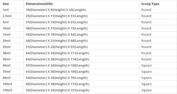 The measuring scoops are available in a variety of colours and are readily available in clear and blue colour. They are available in a comprehensive range of sizes, dimensions and shapes. The measuring scoop can be flat bottom, the volume rounded bottom or other shapes as per customer requirement and are available from sizes 1ml to 150ml.