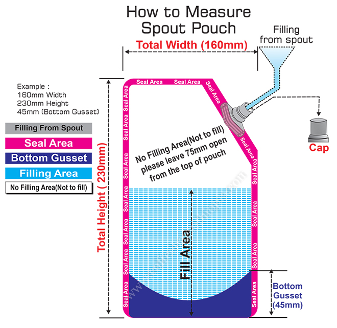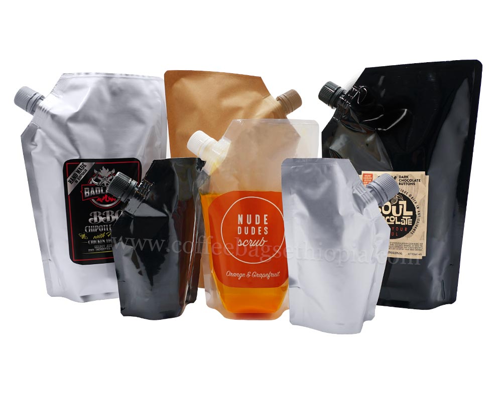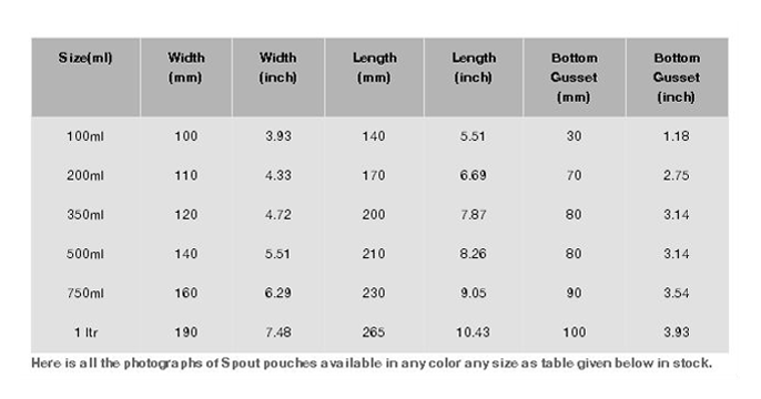 All pouches are fixed with nozzles. The nozzles are placed at either in the centre of the pouch or at a 90 degree angle. The size of the pouches starts from 100ml to 1 litre.